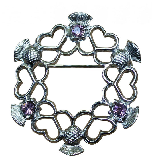 Scottish Thistle Polished Chrome Plaid Sash Brooch inset with Coloured Stone