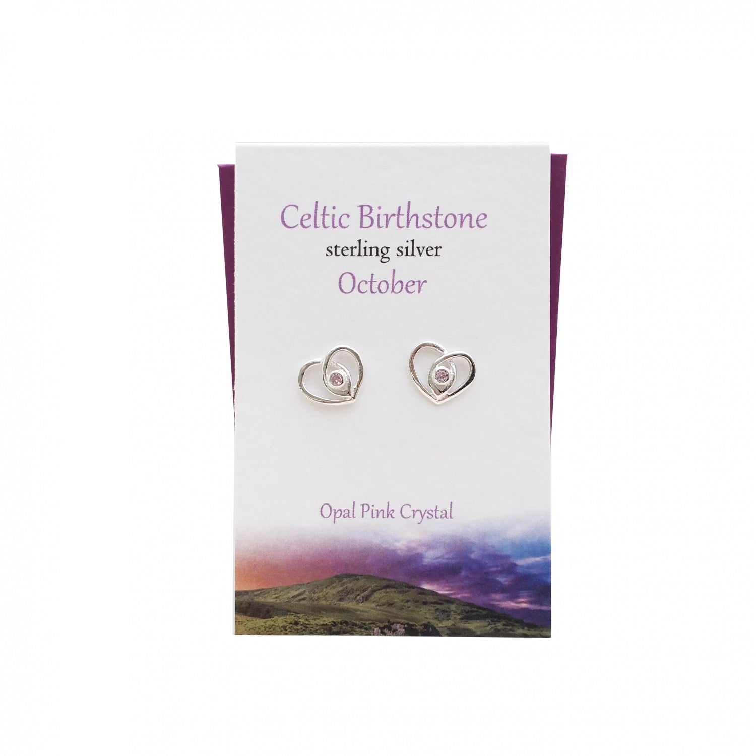October Celtic Birthstone silver heart stud earrings with a Opal Pink gem.