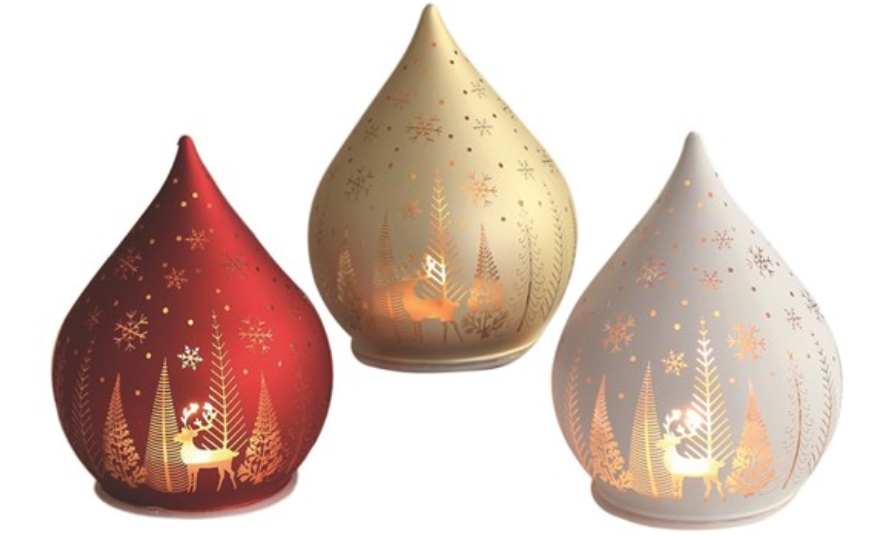 3 Assorted flickering light glass teardrop decoration in red, white and gold with a festive scene detail. Real flame effect.