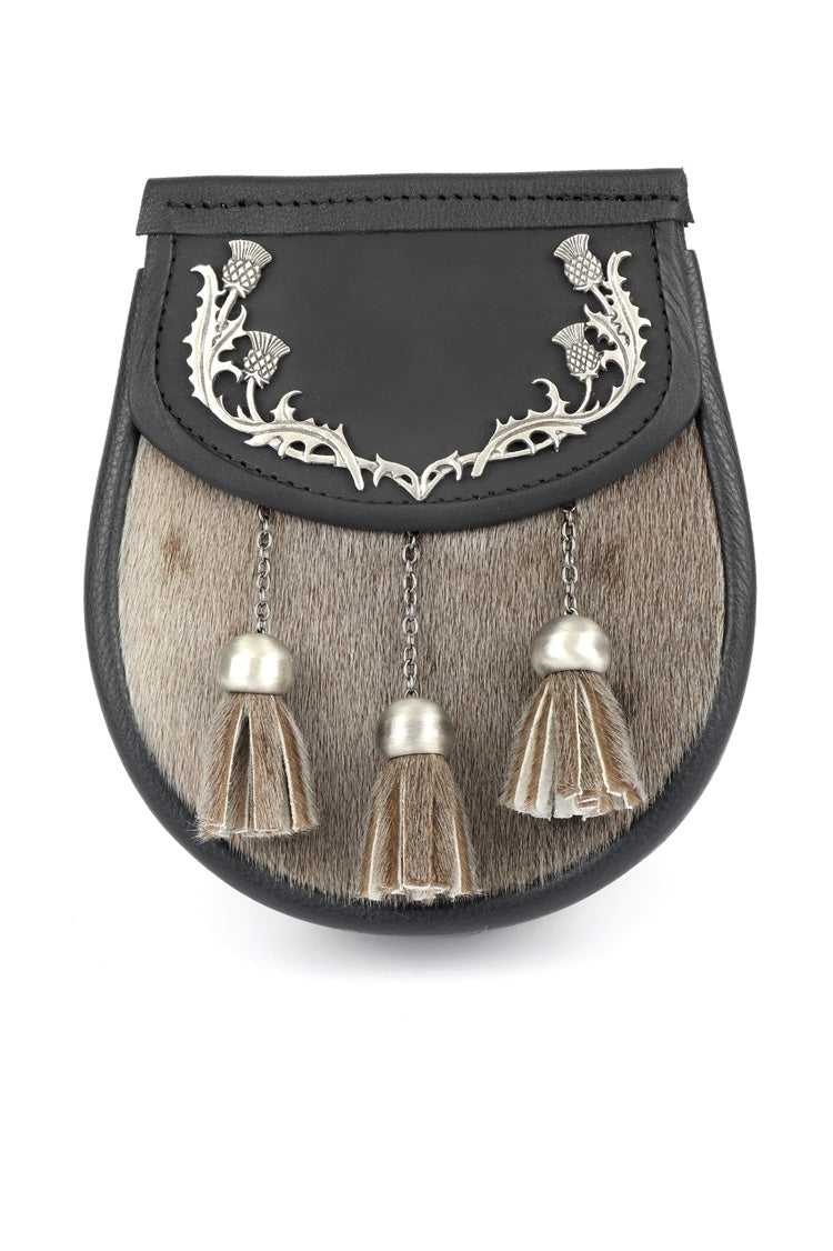 A superior semi dress sporran with in a traditional simple design with grey seal fur and chrome ball topped tassels. Featuring a traditional Scottish Thistle Prince Charlie plate.