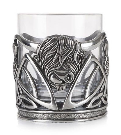 A stunning pewter Highland cow and thistle whisky tumbler. A very sturdy tactile glass that you will enjoy as much as the dram within. This specific design consists of a beautiful Highland Cow and Thistle design clinging to the glass. It makes a beautiful addition to any dinner party or gathering and will definitely get people talking! When washing our Whisky Tumblers, please only use warm soapy water- these items are not dishwasher safe and will result in damaged and dull pewter. Matching decanter available - please see separate listing or contact us directly. Tumbler measures 7.5cm x 8.5cm Made in the UK by AE Williams.