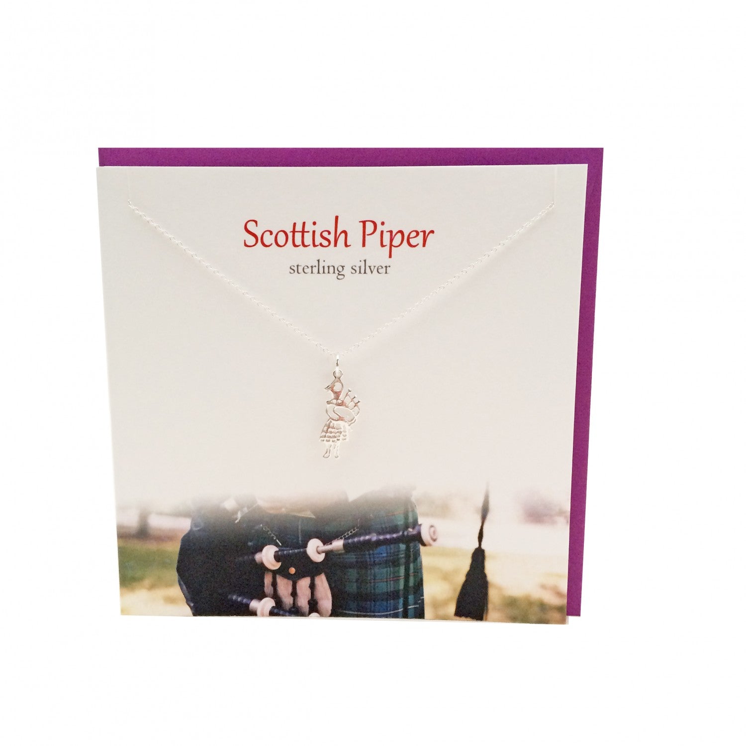 Scottish Piper sterling silver necklacePart Of the 'card & gift in one' jewellery collectionComes packaged On greetings card with envelope12.5 x 12.5cm