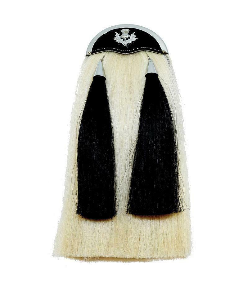 White horse hair body at a standard length of 18 inch long, 2 black horse hair tassels with smooth cones, large gusset at rear with stud fastener, soft, supple gusset to allow easy access, hard wearing sporran which will last for many years.