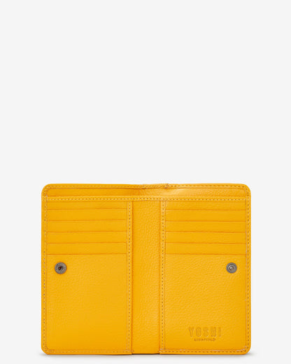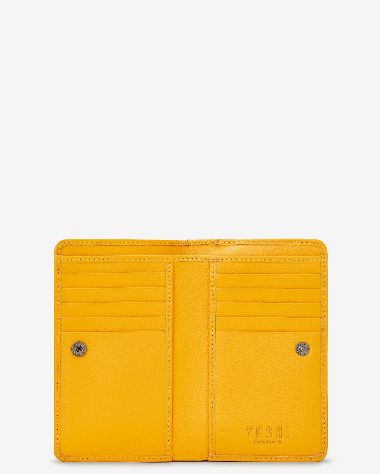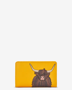 This Highland Cow flap over yellow leather purse for ladies is a lovely design with space for credit cards, coins, and notes.